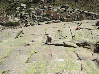 Del resto del largo no tengo más fotos. No sé si aprecia, pero puedo decir que me resultó bien aéreo,con riesgo de péndulo, y que hay que superar un bloque que, aunque tiene una fisura en diagonal para mano derecha, está liso para pies como culo de bebé. Este tío le echó un par, porque no ví ningún cacharrín en la fisura esa diagonal, pero a mí no me pareció nada fácil, y por eso prefiero darle V+. "Galayero" que le dice el Alcojor en su guía...